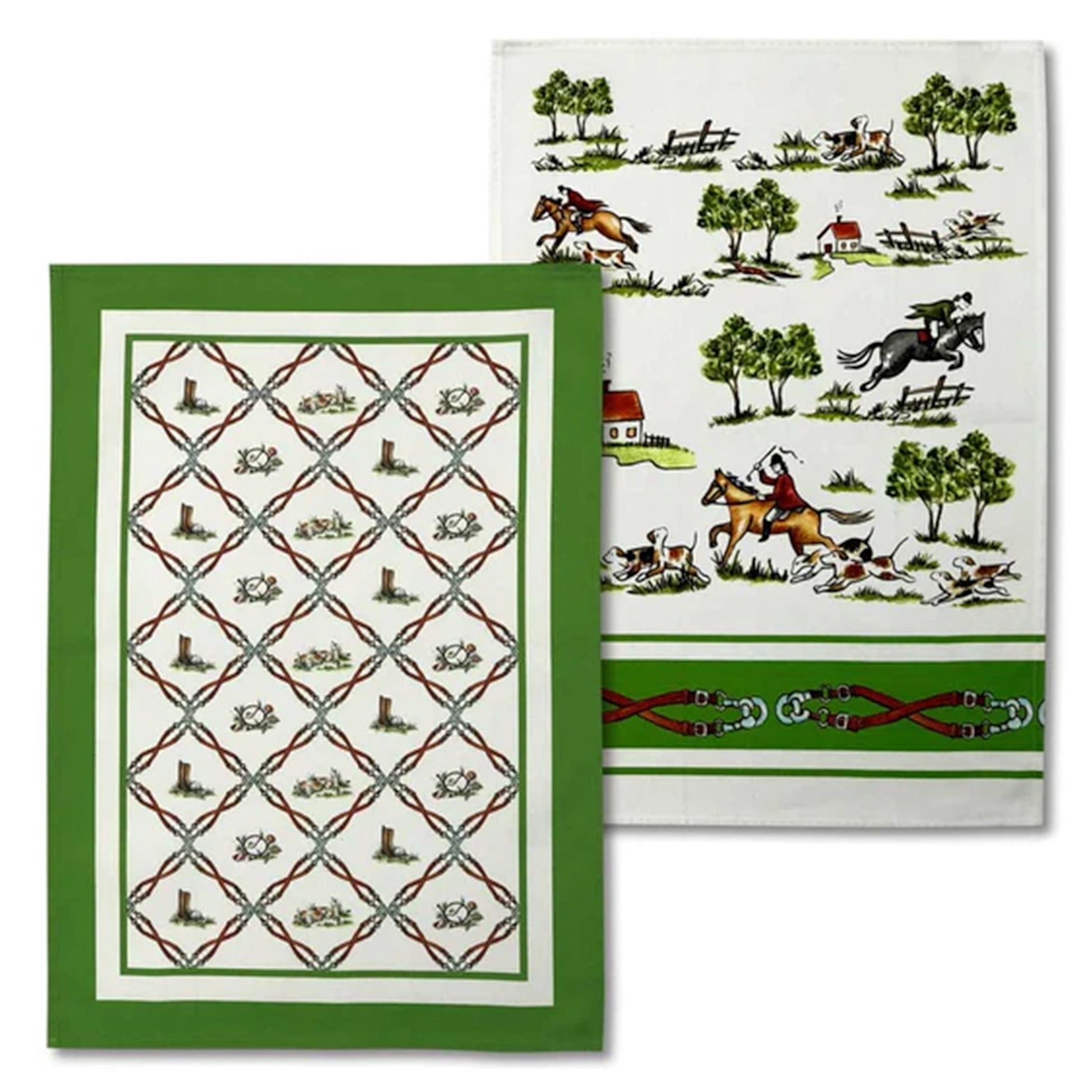 Add a bit of classic equestrian style to your kitchen. These 100% cotton tea towels feature two different colorful foxhunting designs. Horses and hounds dashing across the field; boots and hunting horns, both finished in an attractive green border. A great gift for horse and foxhunting lovers. Made in Portugal for C.E. Corey. Hemmed edges.