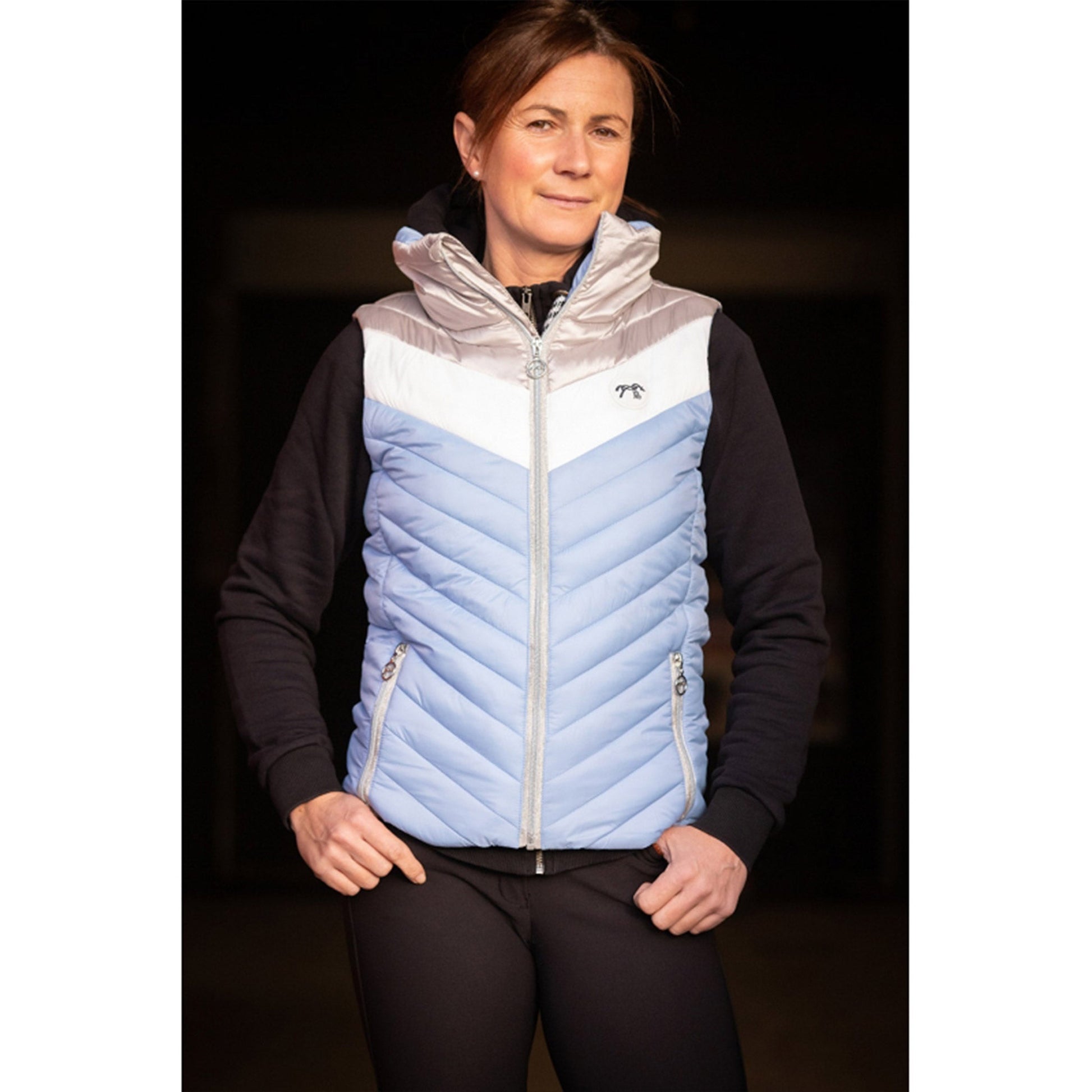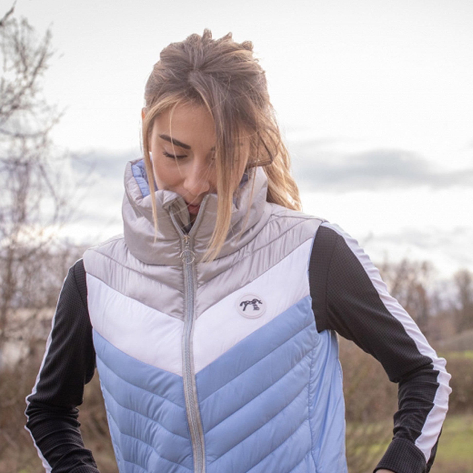 Penelope Collection Camelia Vest - A lightweight and comfortable vest with chic French design for lady equestrians. The color block look is perfect this spring summer vest. Super light to wear, but still warm, Camélia is your perfect ally for the stables, or the city. It comes in Silver/ White/Artic Blue or Navy/White/Pink, for a perfect look. Super comfortable to wear, it comes with a high neck, and two pockets.