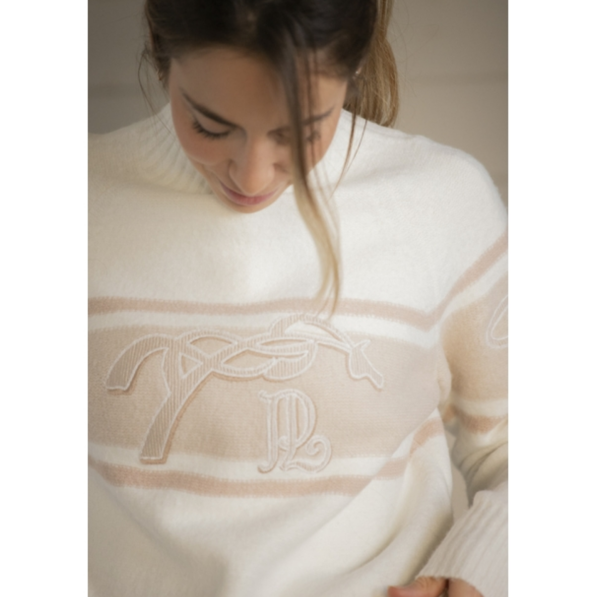 The Noris Pullover from the Pénélope Collection features a funnel neck and is crafted from a very soft two-tone knit. It has a Pénélope embroidery on the front and two elegant arabesque-style embroideries on the sleeves.