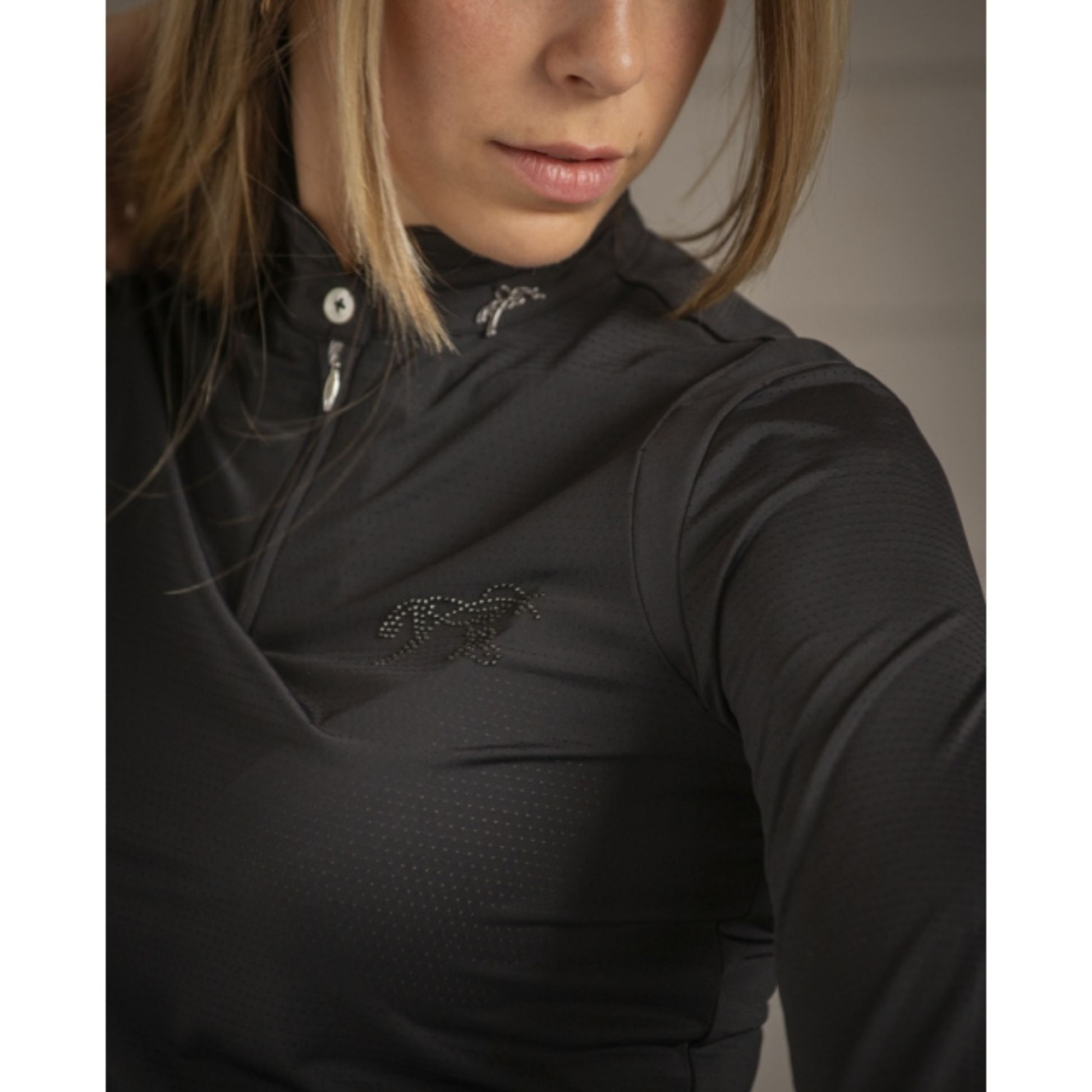 The Techpy Long Sleeve Riding Polo from the Pénélope Collections is designed to fit close to the body thanks to its ultra-stretch, highly comfortable fabric. The technical material ensures maximum comfort whether you’re riding or practicing other sports. It’s perfect for training, to be worn alone in mild weather or as a base layer in colder conditions. The polo features a small stand-up collar with a discreet zip closure topped by a small button. Its look is reminiscent of a show polo, but this time without the traditional white collar, instead, it has a sleek black tone-on-tone collar for a very elegant touch. Two stretch inserts at the armholes enhance the garment’s comfort even further.
